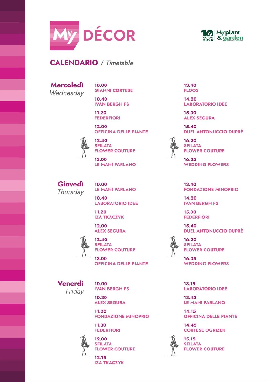 Inoltre, My Décor propone un ricchissimo calendario di eventi (sfilate flower fashion, shooting fotografici, contest decorativi, ambientazioni e workshop) e un’agenda di talk e incontri con esperti da tutto il mondo, dando vita a uno degli appuntamenti più attesi dai professionisti del settore da tutta Italia e dall’estero.